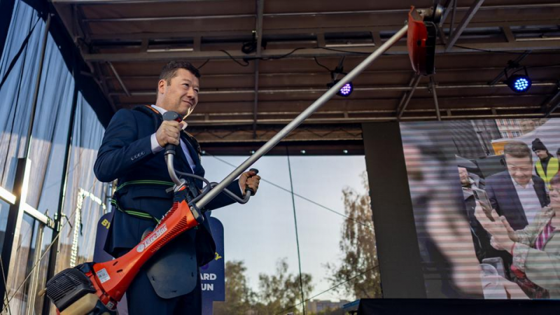 Auch ein Rasentrimmer gehört zu seinen Wahhlkampfinstrumenten: Der tschechische Rechtspopulist Okamura bedient sich damit beim argentinischen Präsidenten Milei.