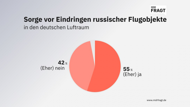 In der MDRfragt-Gemeinschaft lösen diese Vorfälle nicht selten Beunruhigung aus. In einem aktuellen Stimmungsbild des MDR-eigenen Meinungsbarometers äußern 55 Prozent der Befragten die Sorge, dass russische Flugobjekte zunehmend in den deutschen Luftraum eindringen könnten.