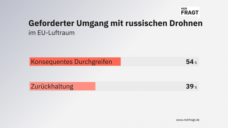In der MDRfragt-Gemeinschaft wird ein Vorgehen tendenziell bevorzugt. So spricht sich die Mehrheit der Befragten für ein konsequentes Durchgreifen im Umgang mit den Drohnen aus. Deutlich mehr als ein Drittel plädiert hingegen auf Zurückhaltung, um eine mögliche Eskalation zu vermeiden.