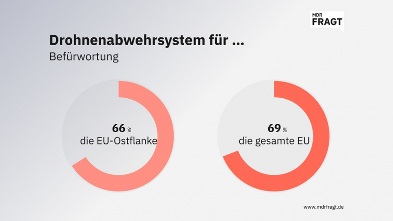 Beim Großteil der Befragten stoßen beide Varianten auf Zuspruch. Demnach sprechen zwei Drittel für ein Drohnenabwehrsystem an der EU-Ostflanke aus. Etwas mehr als zwei Drittel würden dieses auch für die gesamte EU befürworten.