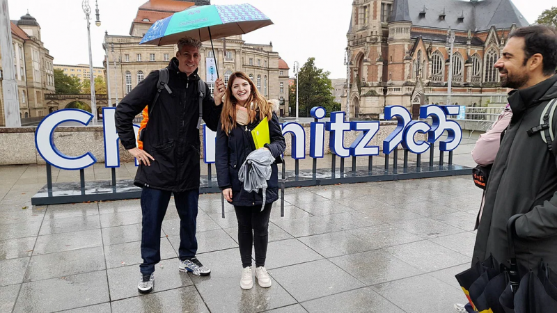 Danny Weigelt ist in seinem Element, wenn er auf Englisch erklärt: "So Leute, wir stehen hier auf dem zentralen Marktplatz, wir haben ein altes und ein neues Rathaus." Der 37-Jährige in Turnschuhen und Regenjacke führt eine Gruppe von etwa 15 internationalen Gästen durch die Kulturhauptstadt Chemnitz 2025. Die von ihm initiierten Free Walking Touren, also kostenlosen Stadtführungen, bieten er und seine Freunde jeden Sonnabend an. Das Interesse ist riesig und manchmal kaum zu bewältigen.