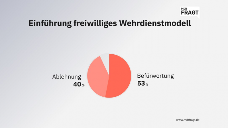 In der MDRfragt-Gemeinschaft stößt das bisher geplante Wehrdienstmodell ohne Losverfahren durchaus auf Zuspruch. In einem aktuellen Stimmungsbild des MDR-eigenen Meinungsbarometers wird dieses von der Mehrheit der rund 20.000 Befragten befürwortet.