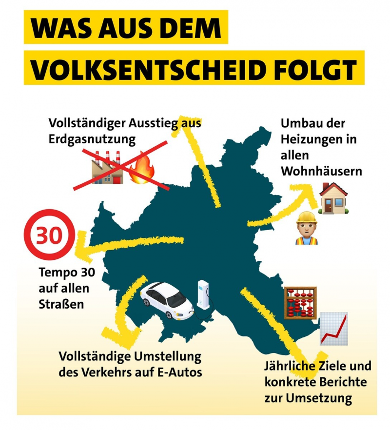 Ganz konkret verlangt das Ergebnis, dass Hamburg bis 2040 klimaneutral wird. Laut Volksentscheid sollen jährliche Ziele festgelegt und durch unabhängiges Monitoring überprüft werden. Bei Nichterreichen werden Sofortmaßnahmen fällig. Unter anderem soll der Verkehr in der Stadt vollständig elektrifiziert werden. Verbrenner dürfen nicht mehr nach Hamburg hinein. Der private Pkw-Verkehr soll insgesamt reduziert und verlangsamt werden: Ein Tempolimit von 30 km/h soll stadtweit gelten.