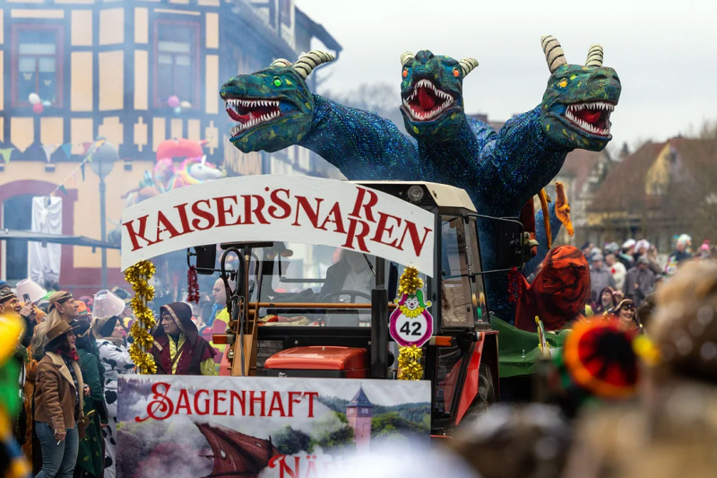 Narren ziehen beim Historischen Karnevalsumzug in Wasungen mit einem aufwändig gestalteten Wagen durch die Straßen.Bildrechte: picture alliance/dpa | Michael ReichelEine traditionelle Figur in Thüringen und Sachsen-Anahlt sei der sogenannte Erbsbär, erzählt Stückrad. Dabei wird einer Person am ganzen Körper Stroh befestigt und diese dann durch das Dorf geführt, um Gaben einzusammeln. Eine ähnliche Tradition sei das sogenannte Zampern in der Lausitz, bei dem ebenfalls Gruppen durch die Dörfer gehen, um Speck, Eier oder Schnaps zu erbitten.