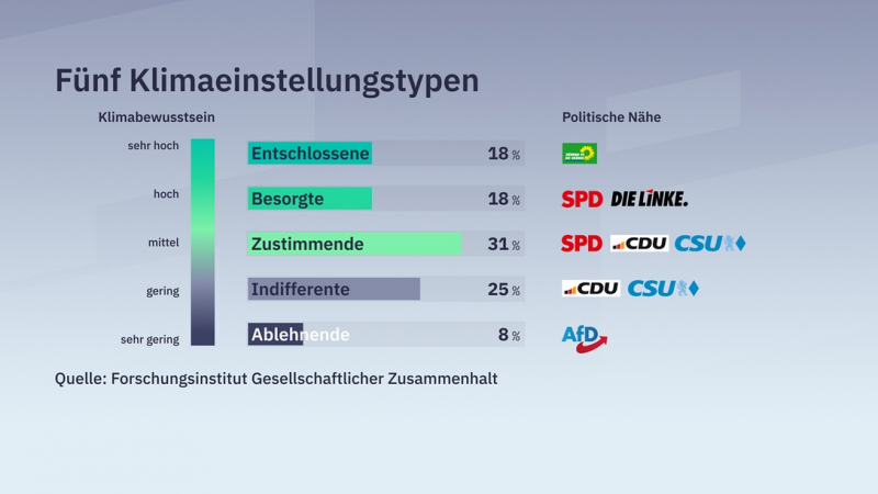 Bildrechte: Forschungsinstitut Gesellschaftlicher ZusammenhaltJeweils 18 Prozent der Befragten werden als sogenannte Entschlossene oder Besorgte eingeordnet, mit einem sehr starken beziehungsweise starken Klimabewusstsein. Die größte Gruppe mit 31 Prozent sind die "Zustimmenden". Diese drei Gruppen zusammen machen mehr als zwei Drittel der Bevölkerung aus. Sie sagen: Wir müssen mehr machen beim Klimaschutz. Dann gibt es noch die Gruppe der Indifferenten, das sind 25 Prozent der Befragten, und die Ablehnenden, die kleinste Gruppe mit acht Prozent, die Klimapolitik ablehnen.