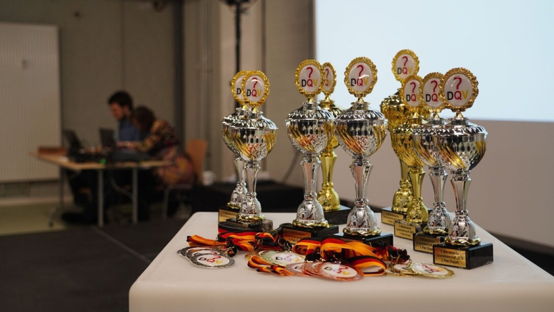 Am Ende der Meisterschaften rauchen zwar den Quizzern die Köpfe. Aber sie sind um einen Tag in freundschaftlicher Gemeinsamkeit und auch um Einiges an Wissen reicher. Und manche können einen Pokal mit nach Hause nehmen. So halten Maximilian Bitz, Suse Kley und Steffen Löwe stolz Pokale in der Hand. Löwe kann seinen Spitzenplatz im Einzelwettbewerb auch dieses Jahr verteidigen. Doch auf der Siegertreppe sei für ihn noch Luft nach oben: "Ich habe noch nie den Deutschland-Cup gewonnen. Das wäre mal was."