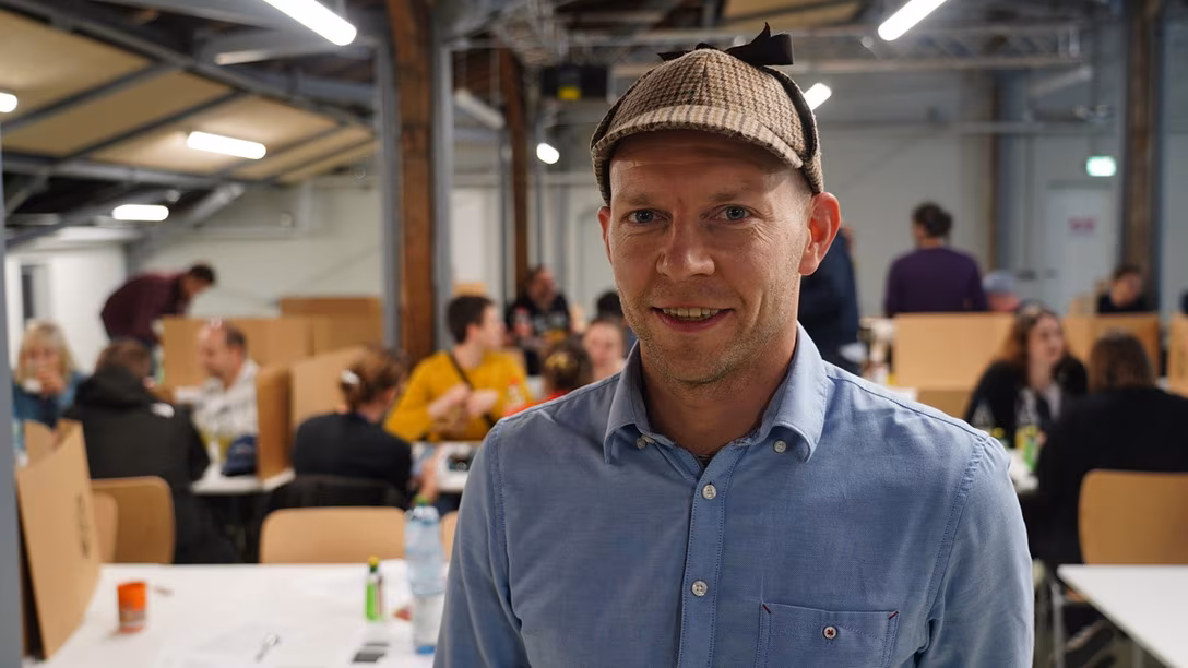 Seine Sherlock-Holmes-Mütze habe ihn bereits Erfolg gebracht, sagt Maximilian Bitz. Bildrechte: MDR/Konstantin HenßEtwa 50 Teilnehmende gebe es dieses Jahr bei den Mitteldeutschen Meisterschaften, sagt Mitorganisator Bitz. "Es sind über die Jahre mehr geworden." Immer beliebter werde auch das Kneipenquizzen, wodurch Bitz auch das Quizzen liebengelernt habe.