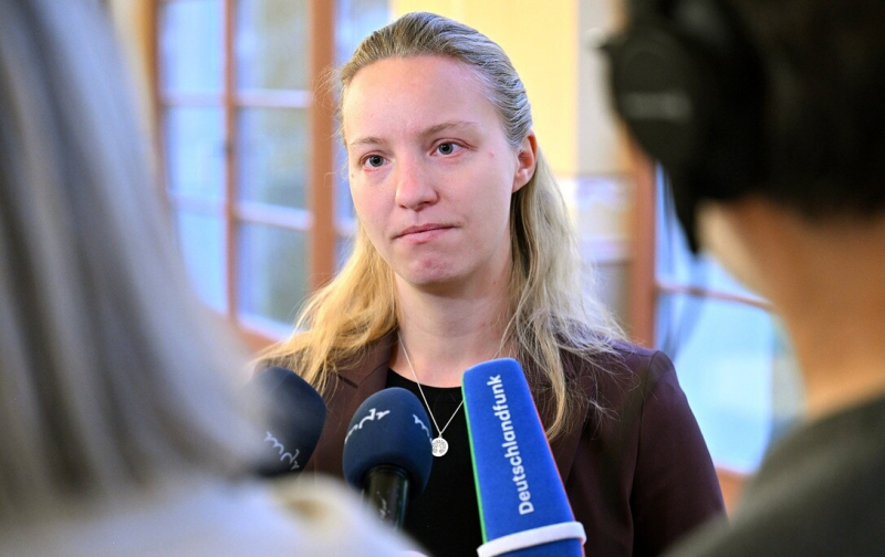 Vivien Rottstedt (AfD), Abgeordnete im Thüringer Landtag, spricht mit Journalisten im Thüringer Verfassungsgerichtshof nach der Urteilsverkündung in einem Normenkontrollverfahren.Bildrechte: picture alliance/dpa/Martin SchuttFall in Leipzig: Klage von Aktivist der Partei „Der III. Weg“ ab