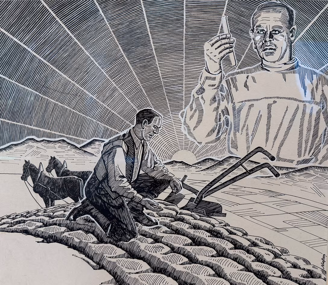 Ein Holzschnitt aus den frühen 50er-Jahren von Andreas Nießen zeigt einen Bauern mit Pflug, und im Hintergrund einen Chemielaboranten.Bildrechte: Andreas MöllerBei den Nationalsozialisten – nach der Scheidung von seiner jüdischen Frau – geschah dies in einer Propaganda-Einheit, in der DDR bis in die 1980er-Jahre als Gebrauchsgrafiker. So urteilt der Autor: "Die Mühen der Unfreiheit und der mehrfach vereitelte Wunsch, seiner Kunst nachgehen zu können, weil sie nicht 'nationalsozialistisch genug' oder nicht 'sozialistisch genug' war: Sie sind das eigentliche Thema seiner Biografie, das sich bis in die letzten Selbstzeugnisse hindurchzieht. Wo endet der legitime Broterwerb?"
