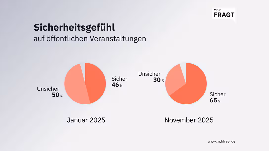 Wenige Wochen nach dem Anschlag zeigte eine Befragung des MDR-eigenen Meinungsbarometers noch ein deutlich anderes Bild des vorherrschenden Sicherheitsgefühls in Sachsen, Sachsen-Anhalt und Thüringen. Im Januar 2025 gab knapp die Hälfte der Befragten (46 Prozent) an, sich tendenziell sicher auf Großveranstaltungen zu fühlen. Bei der anderen Hälfte der Teilnehmenden (50 Prozent) dagegen herrschte da eher ein mulmiges Gefühl vor.