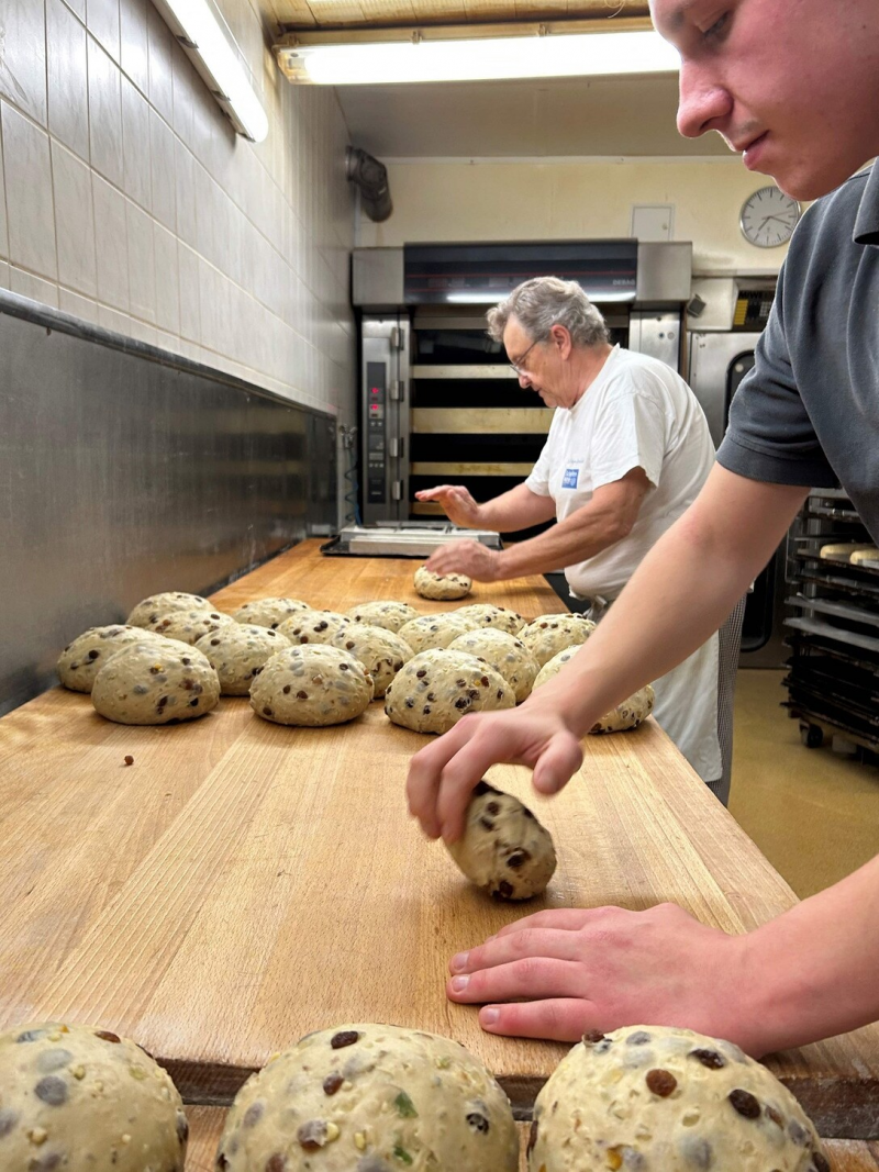 Die Männer walken mit kräftigen Handbewegungen den Stollenteig. "Das muss so sein. Alles Handarbeit. Das sind die Streicheleinheiten für den Stollen", sagt Stephan Fiedler, der seit 55 Jahren Stollen bäckt. Es riecht nach warmer Butter und einem Hauch von Zitrusfrüchten mit Rum, während der Hefeteig für eine gute Stunde in den Formen ruht – Nachschub wird dringend gebraucht.