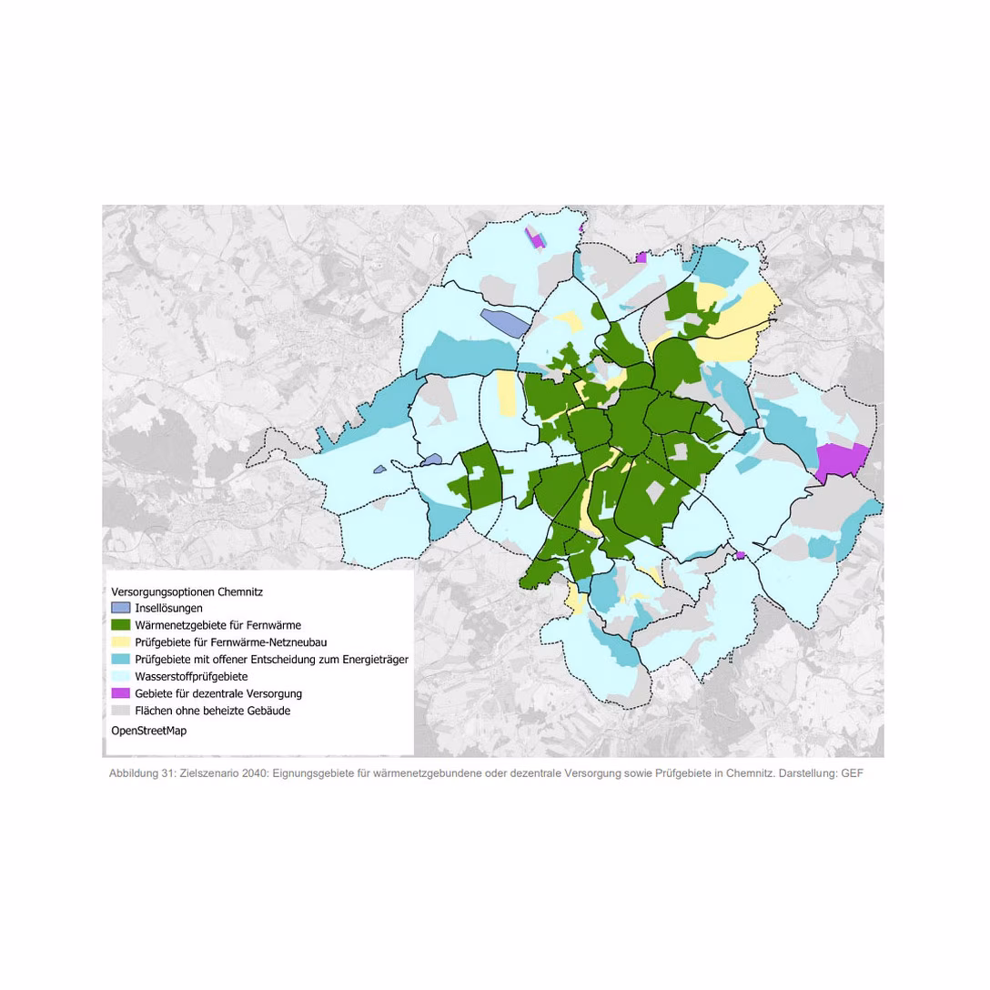 Potenzielle "Wasserstoffprüfgebiete" in der kommunalen Wärmeplanung der Stadt Chemnitz.Bildrechte: Stadt Chemnitz/ GEW Umweltorganisationen wie Greenpeace kritisieren den Einsatz von Wasserstoff in der Wärmeversorgung – auch vor dem Hintergrund, dass grüner Wasserstoff auch in den kommenden Jahrzehnten rar und teuer sein könnte. Carina Kühnel ist Leiterin des Chemnitzer Umweltamtes und damit für die Wärmeplanung zuständig. Dass die Kommune große Flächen als "Wasserstoffprüfgebiete" ausgeschrieben hat, bedeute nicht, dass auf diesen Flächen nun tatsächlich final mit Wasserstoff geheizt werden soll. Erst, wenn ein Prüfgebiet in zwei Jahren als Netzausbaugebiet ausgeschrieben werde, trete das ein, betont Kühnel, die sich von den Kritikern des Entwurfes missverstanden sieht.