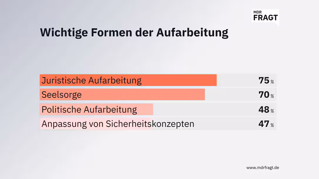Hätte das Landeskriminalamt von Sachsen-Anhalt erkennen müssen, dass der Täter wirklich gefährlich ist? Hätten Stadt und Polizei den Weihnachtsmarkt anders absichern müssen? Wäre der Anschlag zu verhindern gewesen? Mit diesen Fragen beschäftigt sich ein parlamentarischer Untersuchungsausschuss. Die Ergebnisse sollen noch vor der Landtagswahl vorliegen, im Sommer 2026. Auf die politische Aufarbeitung des Anschlags legt nur jede und jeder zweite Befragte Wert (48 Prozent). Ronny (47) aus dem Landkreis Sonneberg begründet in seinem Kommentar, warum das für ihn nicht wichtig ist: "In einem Parlamentarischen Untersuchungsausschuss geht es in der Regel lediglich darum, dem jeweiligen politischen Gegner die Schuld in die Schuhe zu schieben. Eine tatsächliche Aufarbeitung oder Erkenntnisse, wie solche Taten zukünftig verhindert werden können, sind nicht zu erwarten." Nico (49) aus dem Landkreis Hildburghausen findet: "Sobald sich die Politik einmischt, wird nie was richtig aufgearbeitet! Sie sind die Ursache und der ausschlaggebende Punkt und werden ja nicht sich selbst die Schuld geben!"