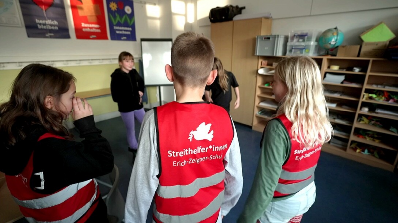 Schulsozialarbeiterin Nicole Handrack bildet einige Schüler als Streitschlichter aus.Bildrechte: MITTELDEUTSCHER RUNDFUNKObwohl sich die außerschulischen Probleme von Schülern häufen, wurde die Schulsozialarbeit-Stelle an der Erich-Zeigner-Grundschule gestrichen. Das kommt bei den Schülerinnen und Schülern nicht gut an. Ein Mädchen findet das "sehr traurig". Zu wem sie gehe, wenn etwas ist? "Dann gehe ich zu niemanden so richtig", erzählt ein anderes Mädchen. Sie weiß nicht, wem sie sich anvertrauen soll. Mit ihren Eltern oder ihrer Lehrerin wolle sie dann über bestimmte Probleme nicht reden.