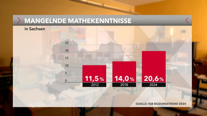 Entwicklung der Mindestanforderungen im Fach Mathematik bei Neuntklässlern in SachsenBildrechte: MITTELDEUTSCHER RUNDFUNK"Ja, der Freistaat Sachsen ist in einer ernsten finanziellen Lage und deswegen mussten wir auch im Bildungsbereich schmerzhafte Prioritäten setzen“, erklärt Kultusminister Conrad Clemens MDR INVESTIGATIV im Interview. Man müsse alles daransetzen, dass diese Schüler die gleichen Chancen haben wie ihre Vorgänger. Clemens will in Sachsen erreichen, dass genügend Unterricht stattfindet. "Und da gibt es im Bildungsetat nur wenige Stellschrauben, an denen man wirklich sparen kann. Und dazu gehört leider auch das Schulbudget."