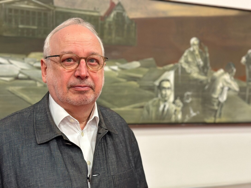 Maler Reinhard Minkewitz freut sich, dass sein Bild "Aufrecht stehen" nun im Hauptgebäude der Universität ausgestellt wird.Bildrechte: Ole Steffen/MDRIch war völlig platt, wie er über diese lange Zeit diesen Gedanken an ein Bild hochhielt und glaubte, dass ein Bild wichtig für die gesamte Diskussionslandschaft ist.