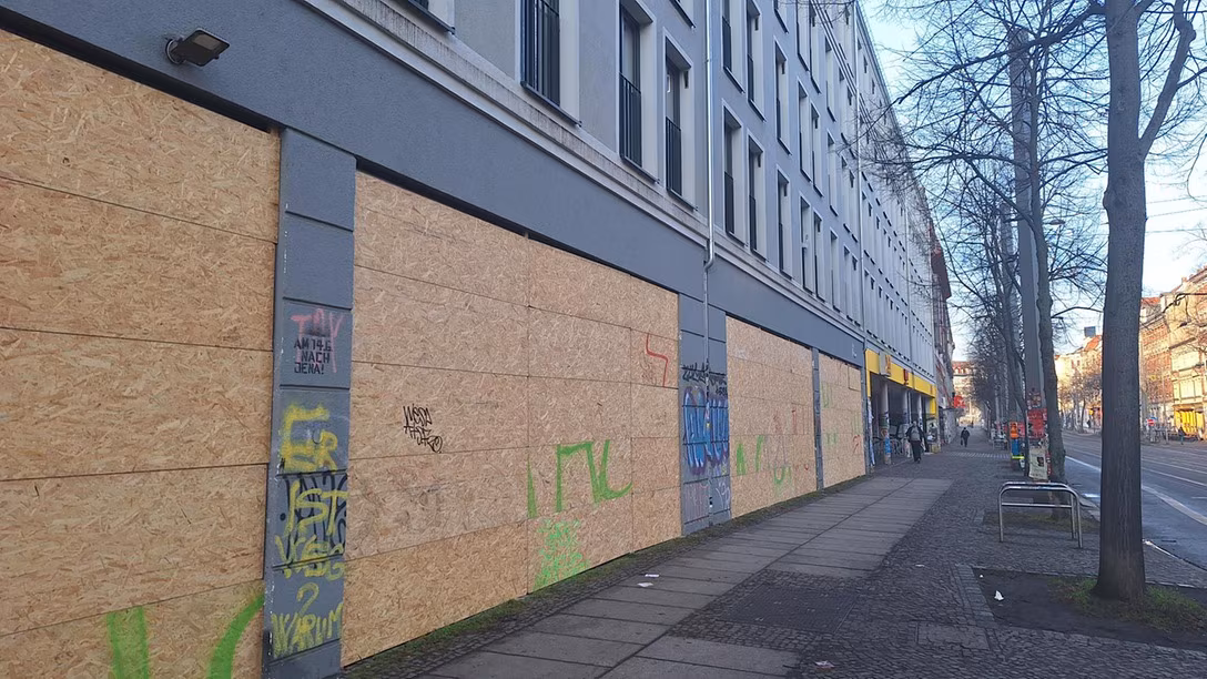 Damit nichts zu Bruch geht, haben einige Geschäfte ihre Glasfronten gesichert.Bildrechte: Kathrin König10:51 Uhr | Gemüsehändler schließt eher: Kaum Kundschaft