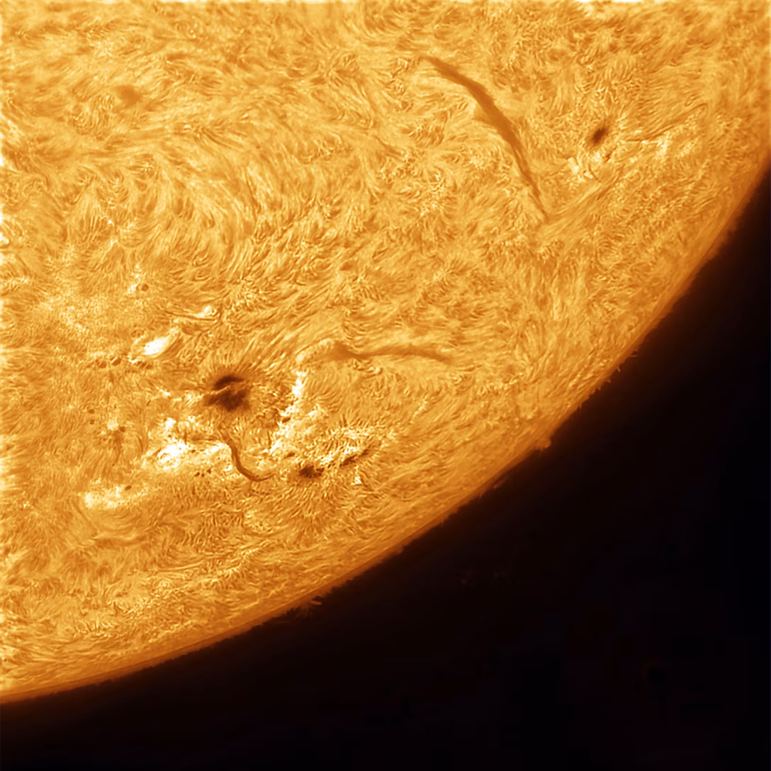 Das Foto zeigt die Sonne im sogenannten H-Alpha-Licht, also in einem Wellenlängenbereich, der dem menschlichen Auge verborgen bleibt. Dabei kommen die Sonnenflecken und Sonnenausbrüche besonders gut zum Vorschein. Aufgenommen wurde das Foto am Planetarium Halle (Saale) am 6. August 2024.Bildrechte: Planetarium der Stadt Halle (Saale) / Michael Reuter