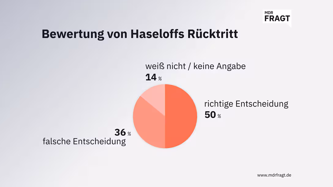 Bildrechte: MITTELDEUTSCHER RUNDFUNKDie Hälfte der Befragten (50 Prozent) findet den Rücktritt richtig. Ein reichliches Drittel (36 Prozent) sieht das anders und findet den Wechsel falsch. Und die restlichen 14 Prozent sind unentschlossen, mehr als in vielen anderen Umfragen.