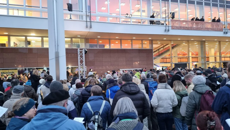 Rund 200 Menschen haben sich vor dem Kulturpalast zum gemeinsam Bürgersingen versammelt. Die Veranstaltung ist die Auftaktkundgebung für die Menschenkette, die sich um 18 Uhr schließen soll.