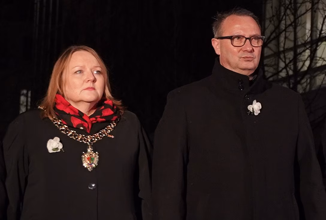 Gemeinsam mit Dresdens Erstem Bürgermeister Jan Donhauser stand Coventrys Oberbürgermeisterin Rachel Lancaster in der Menschenkette. Bildrechte: MDR/Adam BeyerDies sei eine starke Botschaft und ein Symbol für Hoffnung und Einheit. Die heutige Freundschaft beider Städte sei ein Zeichen dafür, dass sich Konflikte und Verlust überwinden ließen, sagte Lancaster. Coventry war durch deutsche Luftangriffe am 14. November 1940 zerstört worden.