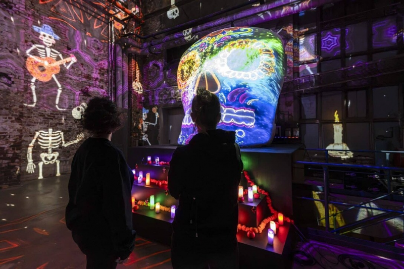 Das mexikanische Totenfest Día de los Muertos hat diesen Ausstellungsraum inspiriert.Bildrechte: Kunstkraftwerk LeipzigIn einem anderen fangen die Figuren auf den Bildern Frida Kahlos an, miteinander zu tanzen. Bei einer KI-generierten Modenschau läuft die Künstlerin in ihren bunten Gewändern über den Catwalk. Braucht Kahlos Kunst eine solche Show? Ja, meint Paolo Löffler, genau das mache das Kunstkraftwerk aus. "Wir nennen uns Digital Art Center und unser Ansatz ist, wie man mit diesen neuen Technologien andere Erlebnisse schafft."