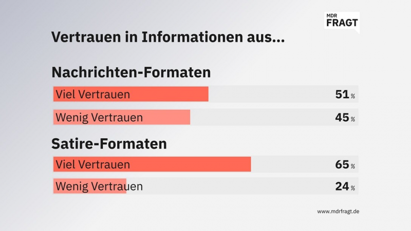 Die Befragung der Teilnehmerinnen und Teilnehmer des Meinungsbarometers MDRfragt hat ergeben, dass knapp zwei Drittel der Befragten, die Satire-Formate konsumieren, viel Vertrauen in Informationen aus Satire-Formaten haben. Erstaunlich ist, dass sogar eine Mehrheit Satire-Formaten mehr Vertrauen schenkt als Nachrichten-Formaten. Demnach haben 65 Prozent der Befragten viel Vertrauen in Satire-Formate, während 51 Prozent der Befragten viel Vertrauen in Nachrichten-Formate haben.