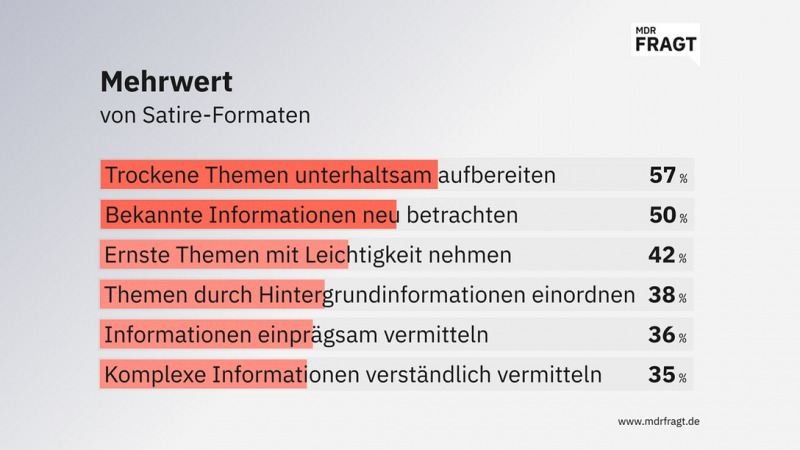 Die Konsumenten von Satire-Formaten sind auch dazu befragt worden, welche Aspekte sie als Mehrwert von Satire-Formaten sehen. Eine Mehrheit von 57 Prozent sieht dabei die Aufbereitung "trockener" Themen als Mehrwert an. Insbesondere für 73 Prozent der jungen Leute (16-29 Jahre) war das der ausschlaggebende Mehrwert.