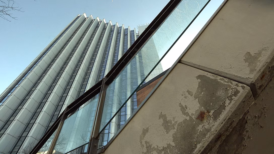Blick auf die markante Fassade des Congress Hotels, das 1974 eröffnete. An vielen Stellen zeigt sich der Sanierungsbedarf. Bildrechte: MITTELDEUTSCHER RUNDFUNKHoffen auf Neuanfang