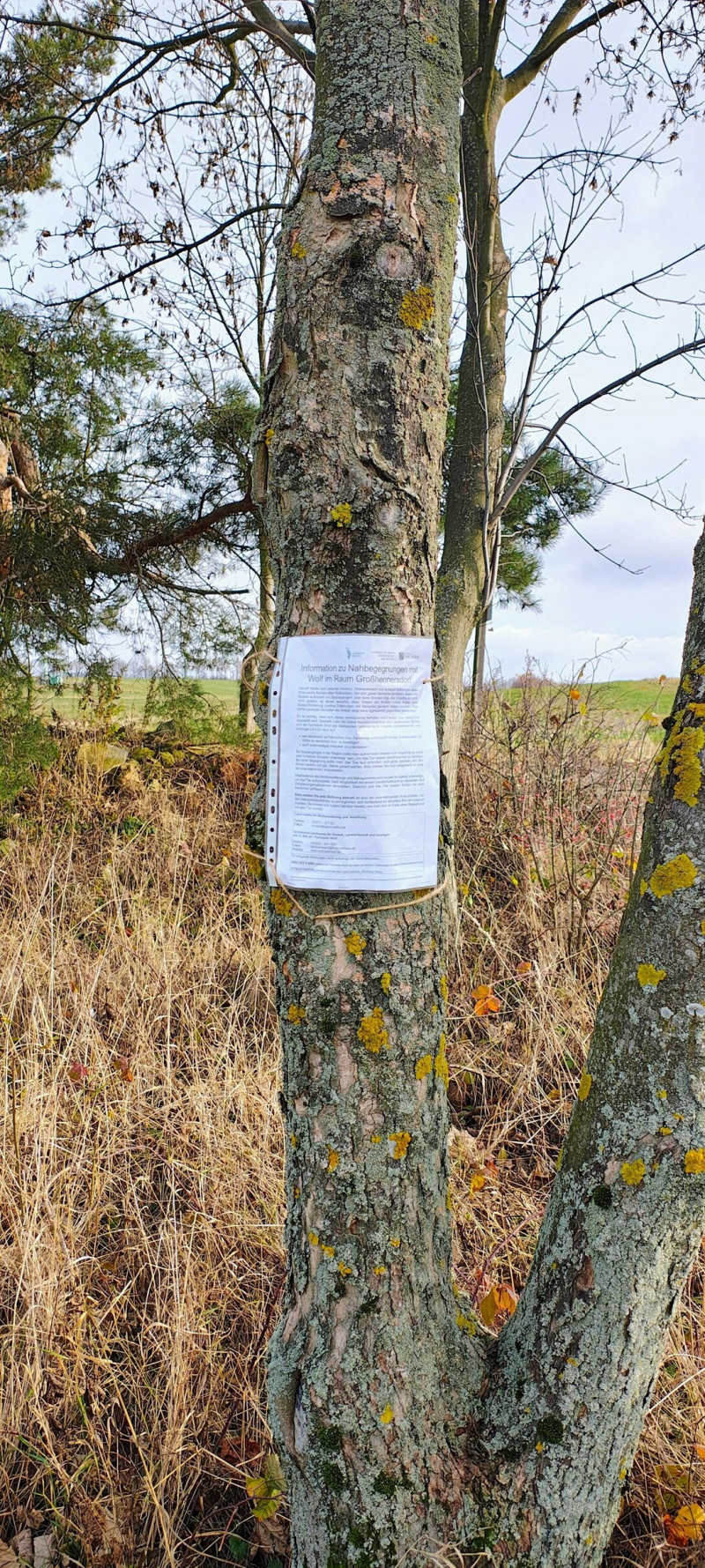 Der Landkreis Görlitz warnte im Winter 2026 mit Zetteln vor dem Anlocken und Anfüttern von Wölfen, nachdem ein Welpe bei Zittau sich Menschen näherte. Nachdem der inzwischen tote Wolf "MT15" nach Polen weiterzog, wurden die Zettel abgehängt.Bildrechte: Landratsamt GörlitzProblem-Wölfe in Knappenrode, Rietschen und Cunewalde