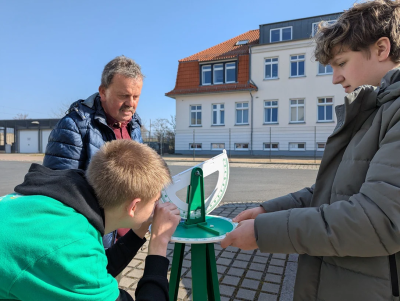 Neben Florian und Konstantin steht Frieder Henker und gibt Hinweise. Der Mathe- und Physiklehrer a.D. organisiert seit 2017 den sogenannten Großenhainer Grundlinientag. "Das ist ein Projekttag, an dem die Schüler Landesvermessung erleben sollen."
