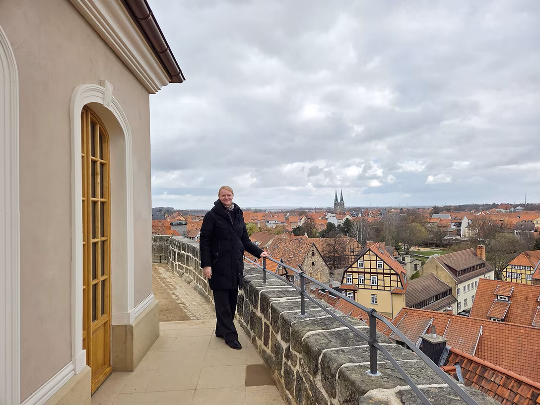 Die Leiterin der Städtischen Museen und Archive Quedlinburg, Uta Siebrecht, steht über den Dächern der Unesco-Welterbestadt. Bildrechte: Anne SailerUmfassende Sanierung des historischen Ensembles