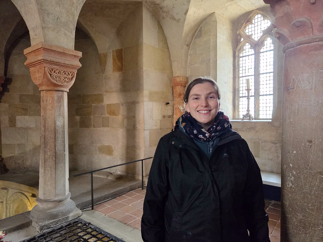 Linda Herbst steht in der Krypta der Stiftskirche St. Servatii hoch über der Altstadt von Quedlinburg. Bildrechte: Anne SailerDer Stiftsberg war schon immer ein Erinnerungsort, und das soll er bleiben.