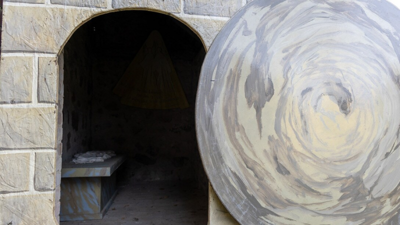 Die Osterkirche Trüben zeigt an mehreren Stationen das Ostergeschehen – auch das Heilige Grab samt rundem Stein ist nachgebildet. Bildrechte: MDR /Uli Wittstock Kein religiöses Disneyland