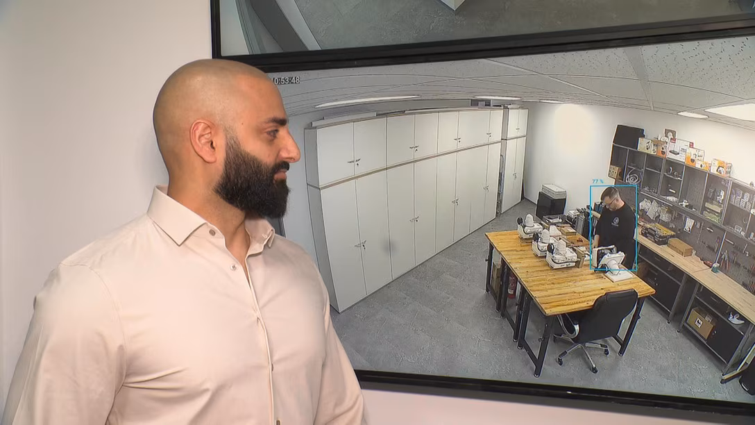 Ramin Al Khakani zeigt ein Kamerasystem, das seine Firma nutzt.Bildrechte: MDRBlack Knight Security mit Unternehmerpreis ausgezeichnet