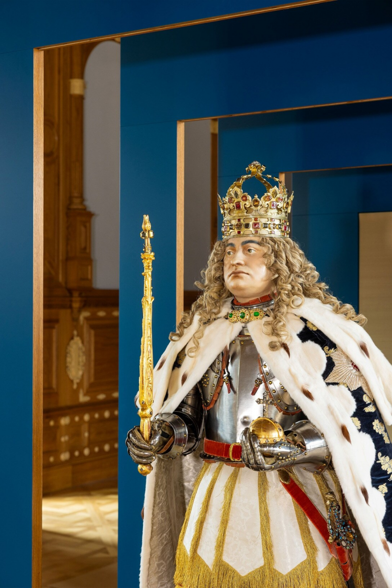 Den blauen Seidensamt-Mantel mit Goldstickerei hatte Sachsens Kurfürst am 15. September 1697 in Krakau getragen, als er König von Polen wurde.Bildrechte: Jürgen Lösel/Staatliche Kunstsammlungen DresdenAußerdem ist August der Starke als lebensgroße Figur zu sehen. Er wurde mit 27 Jahren König von Polen und entwarf seine Krönungskleidung selbst: Dazu gehören ein Rock, der anknüpft an antike Traditionen, ein Harnisch, in dem August gegen die Türken gekämpft hat und der hermelingesäumte Mantel aus blauem Samt.