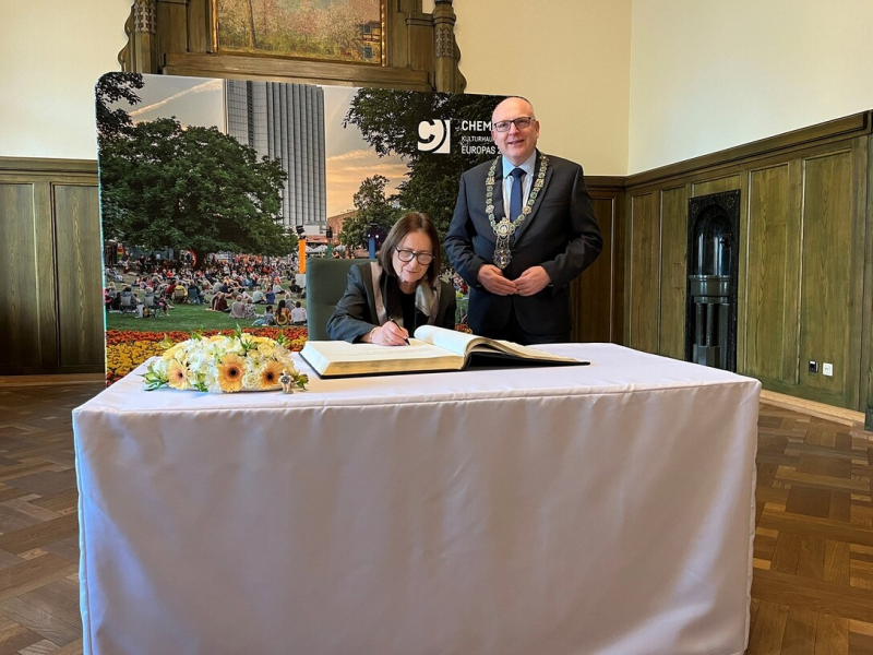 Irina Scherbakowa trug sich im Beisein von Oberbürgermeister Sven Schulze ins Goldene Buch der Stadt Chemnitz ein.Bildrechte: MDR / Ines Gruner-RudeltScherbakowa ist Gründungsmitglied der Menschenrechtsorganisation Memorial, die in Russland verboten ist. Sie lebt seit 2022 im Exil in Deutschland.