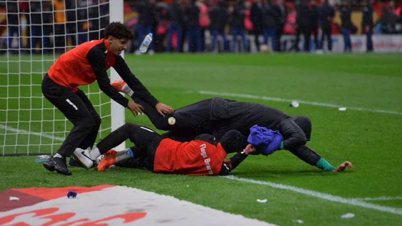 Danach nahm das Drama seinen Lauf: Senegals Spieler und Betreuer wüteten. Trainer Pape Thiaw beorderte seine Spieler nach langen und heißen Debatten in die Kabine. Gleichzeitig übersprangen senegalesische Fans die Bande und lieferten sich mit Ordnern und Funktionären wüste Schlägereien, wie der "Kicker" berichtete. Sogar auf der Pressetribüne spielten sich wilde Szenen ab. Die Reporter aus beiden Ländern beschimpften sich gegenseitig, bespritzten einander mit Wasser und warfen sich gegenseitig Korruption vor.
